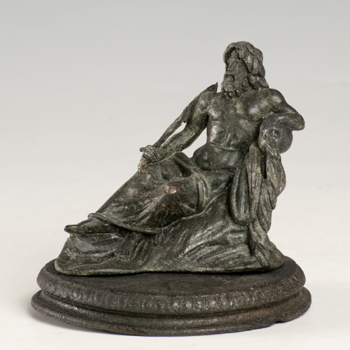 La statuetta raffigura un uomo maturo, caratterizzato da una folta acconciatura con lunghe ciocche ondulate e da una barba riccioluta. Egli sta seduto sopra un enorme masso, mentre un morbodo manto gli copre e avvolge le gambe.
