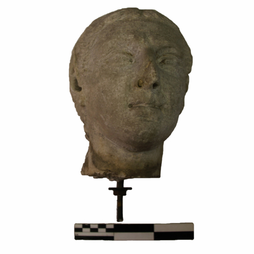 Il viso paffuto possiede un'ampia fronte pienamente in luce, che contrasta con le profonde arcate soppraccigliari che ombreggiano i grandi occhi a mandorla, le cui pupille sono finemente incise. Il naso è diritto, ma parzialmente interessato da una lacuna, mentre perfettamente conservata è la bocca, dalle labbra carnose e piene.