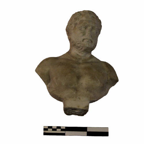 Il naso, per la gran parte abraso, lascia ampio spazio alla folta barba e ai baffi, che coprono una bocca dalle labbra carnose e il mento rotondo.