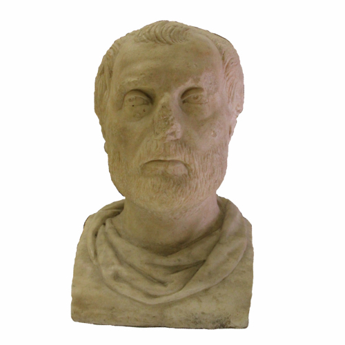 Il volto ritrae una figura maschile, resa con tratti realistici: il viso è squadrato, dalla mascella prominente e dagli zigomi alti e marcati. La fronte è ampia appena incisa da morbide linee, al di sotto di essa, i grandi occhi dalle palpebre pesanti e dalla pupilla incisa, sono lievemente inclinati verso l'alto. Il naso, purtroppo mutilo, doveva essere piccolo e vagamente camuso. Un lieve barba con i baffi circonda la bocca dalle labbra sottili.