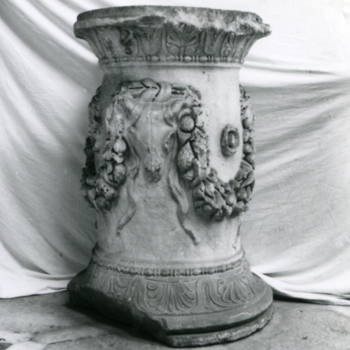 Nelle modanature superiore e inferiore, si rileva la presenza di una decorazione che alterna palette a fiori di loto, astragali e fusarole. Nel campo centrale invece si trova un pesante e ricco festone, colmo di fiori, frutti e foglie, che si appoggia a una serie di bucrani.