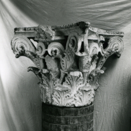 Il capitello, scolpito in un blocco di calcare, è decorato con tre registri di acanto, sormontati da volute a nastro concavo. Nella parte alta dell'elemento architettonico, si rileva la presenza di una rosetta a petali carnosi.