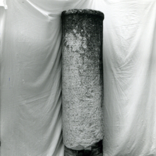 L'iscrizione si trova su un supporto di forma cilindrica allungata realizzato sbozzando un blocco di calcare bianco. Essa è incisa e resa in caratteri capitali: si sviluppa per almeno sei righe e si distribuisce su tutto lo spazio disponibile.
