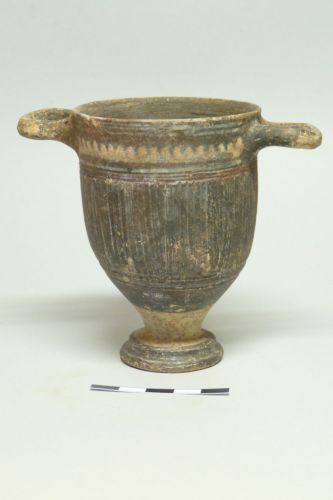 orlo assottigliato, corpo allungato rastremato verso il fondo, anse a bastoncello orizzontali impostate sotto l'orlo a interrompere la decorazone sovradipinta, piede modanato. Vernice nera stesa su tutto il vaso, tranne il collo del piede; vernice stesa anche internamente. Parete decorata da fitta costolatura incisa racchiusa tra due doppie linee orizzontali. All'altezza delle anse ramoscello (?) sovradipinto in bianco e sotto traccia di una banda rossa, una bianca e una gialla