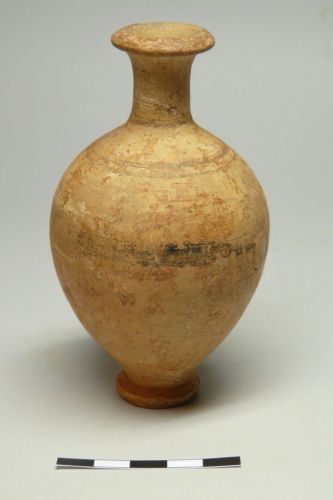 orlo ad anello, breve collo cilindrico, corpo ovoide con piedino ad anello dal profilo esterno triangolare. Vernice nera sull'orlo, fascia alla base del collo, altre due all'inizio del corpo e un'altra, di maggiore larghezza, sul corpo
