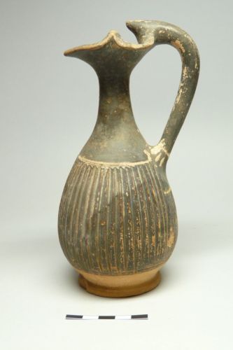 orlo trilobato con doppia solcatura vicino al margine interno, lungo collo cilindrico, corpo ovoide, basso piede ad anello con base d'appoggio piana; ansa a bastoncello a sezione circolare con appendice conica all'attacco dell'orlo; impostata inferiormente sopra la massima espansione. Corpo decorato a baccellature; tracce della decorazione dipinta al di sopra delle baccellature e all'attacco inferiore dell'ansa, dove rimane una serie di petali