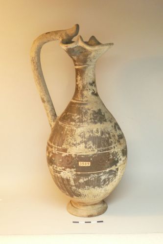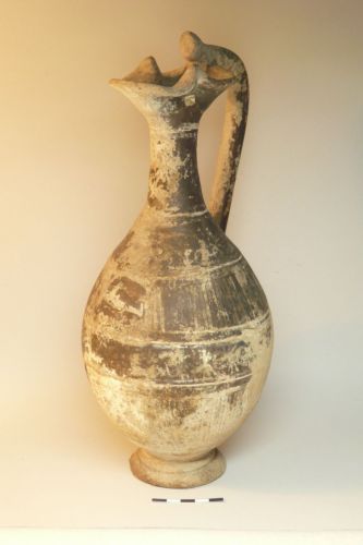 orlo trilobato con lungo collo cilindrico; corpo ovoide con alto piede ad anello sagomato dalla larga base di appoggio; ansa a bastoncello a sezione circolare, sormontante l'orlo con appendice ricurva all'attacco dell'orlo, impostata inferiormente poco sopra la massima espansione. Collo decorato da due solcature orizzontali; corpo con due fasce baccellate delimitate da una doppia linea orizzontale; alla massima espansione fascia con elementi vegetali sovradipinti, di cui restano solo poche tracce