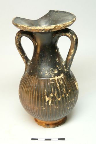 ampio orlo svasato, lungo collo stretto, corpo piriforme, piede ad anello, anse verticali a nastro costolate impostate sul collo e sopra la massima espansione, all'attacco delle baccellature; pseudobaccellature sul corpo; impasto beige, ingobbio, vernice nera