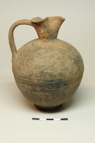 orlo trilobato a margine leggermente ingossato e arrotondato, collo stretto, corpo globulare leggermente rastremato verso il fondo, piccolo piede a disco L'ansa, costolata, è impostata all'orlo e sulla massima espansione (rimangono evidenti le due ditate di attacco delle due parti della costolatura). Impasto bruno e vernice bruno nerastra
