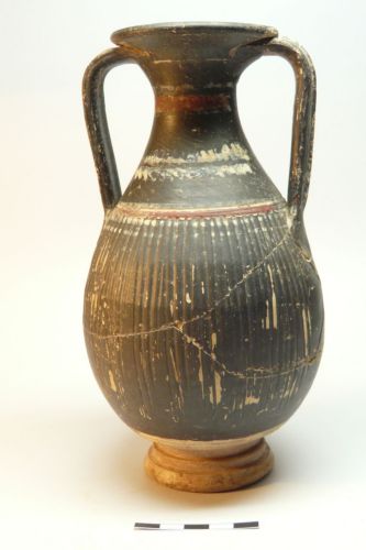 ampio orlo svasato e arrotondato, stretto collo concavo, corpo piriforme con massima espansione nella parte medio inferiore, piede con doppia gola e toro, anse verticali a nastro, costolate. Sul collo fascia in rosso tra due linee in bianco, ramoscelli stilizzati in bianco, sull'attacco del corpo fascia rossa e due linee bianche, corpo decorato da pseudobaccellature impresse