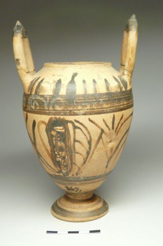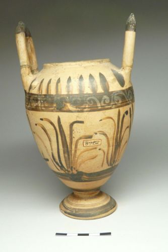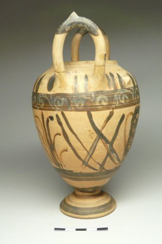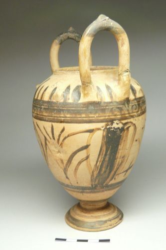 orlo verticale, indistinto, a margine arrotondato; corpo ovoide con alto piede scampanato, esternamente sagomato; anse orizzontali a bastoncello a sezione circolare, sormontanti, impostate alla massima espansione, con apicatura conica; due bugnette coniche sono anche ai lati di ciascuna ansa. Sul corpo due fasce orizzontali (quella superiore decorata da una serie di girali in bianco) incorniciano una fascia a palmette rese in maniera molto schematica alternate a motivi probabilmente vegetali a graticcio; sulla spalla una serie di pennellate verticali parallele; attacco del piede e piede ornati da una fascia in nero
