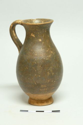 orlo estroflesso a margine indistinto, breve collo cilindrico, corpo ovoide, piede a disco leggermente concavo. Ansa a bastoncello impostata sotto l'orlo e, inferiormente, alla massima espansione. Completamente verniciato, anche internamente. Base risparmiata