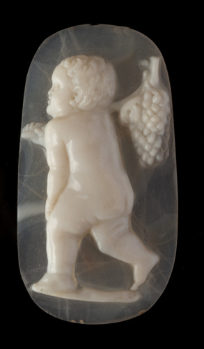 Il cammeo è riconoscibile ne "L'amor con graspo de uva in spalla" citato dagli inventari e può quindi essere attribuito con sicurezza alla decorazione dello stipo conservato nella Sala del Consiglio dei Dieci (si veda Sena Chiesa 1997, p. 126, con riferimenti bibliografici).