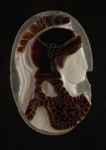 Sul fondo traslucido di forma ovale, si staglia in bianco opaco il profilo, rivolto a destra, di Atena Minerva. Nello strato scuro superiore sono lavorati i capelli, l'elmo e l'egida. Il profilo della dea è caratterizzato dall'occhio grande, con indicazione della pupilla, dalla palpebra spessa, dal naso diritto, che continua la linea della fronte, dalla piccola bocca serrata e dal mento pronunciato. Dall'elmo a calotta liscia, con visiera e paranuca, ornato da un ricco lophos, escono i capelli sulla fronte e in due lunghe ciocche, una che scende sulla spalla, l'altra che attraversa il collo. Il busto di Atena è ricoperto dall'egida, ornata al centro da uno schematico gorgoneion: tale decorazione è resa in modo grafico e non a rilievo, incisa sullo strato scuro della pietra.