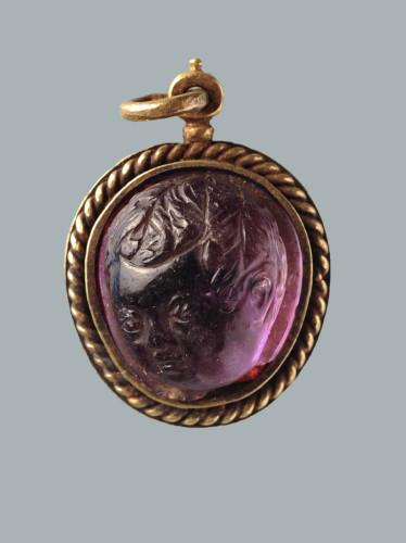 Cammeo in ametista legato in castone d'oro moderno, costituito da una cornice a cordoncino e da una maglia doppia per la sospensione fissata in alto.