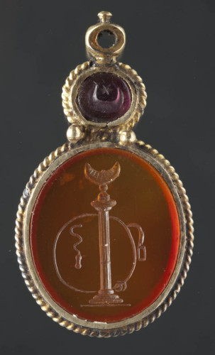 Pendente in oro, con bordo a cordoncino e anello per la sospensione, in cui sono montati due intagli: un piccolo rubino con crescente lunare e stella (II-III sec. d.C.) e una corniola, in cui è raffigurata una colonna sormontata da un crescente lunare con attorno una meridiana, affiancata a destra da uno strigile e a sinistra da una frusta (forse databile al I sec. d.C.). Le gemme potrebbero essere state assemblate nel XVIII secolo in un unico pendente.