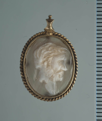 Cammeo legato in castone d'argento dorato con bordo a catena, con anello per la sospensione in alto, sormontato da un piccolo globulo.