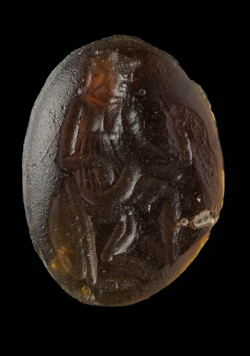 Nella pasta vitrea è raffigurata Atena Minerva seduta, di tre-quarti verso destra, con testa (elmata?) di profilo verso destra; la dea tiene nella mano sinistra una piccola Vittoria, mentre il braccio destro è piegato; in terra a sinistra, uno scudo bombato, rappresentato di profilo.