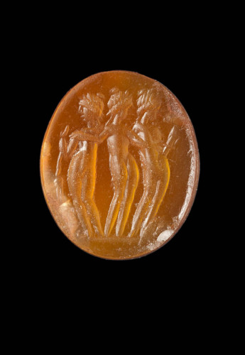 Le tre Grazie, di prospetto, nude e abbracciate, su breve linea del suolo, si dispongono all'interno dell'ovale secondo lo schema caratteristico: la centrale è raffigurata di schiena e con le braccia allargate abbraccia le due fanciulli laterali, viste di fronte. Tutte e tre hanno la testa di profilo, con i capelli raccolti. Non si riescono a leggere gli attributi. Le figure, rese in maniera abbastanza corsiva, mancano di dettagli.