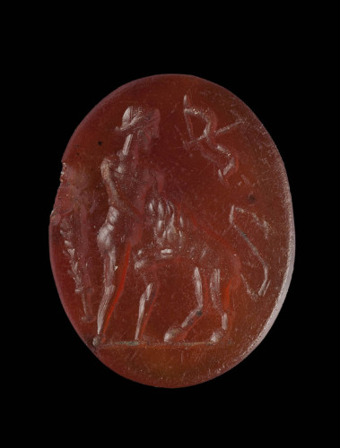 L'immagine raffigurata ha una lunghissima tradizione iconografica, che comincia in Grecia, in età arcaica, ed è uno dei soggetti della saga erculea più diffusi nella glittica, probabilmente per il suo valore di amuleto: Ercole con il leone, raffigurato su pietre di colore rosso, serve infatti a proteggere dalle coliche (sul tema si veda Faraone 2011, pp. 52-54)