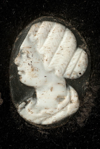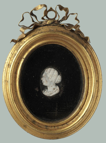 Il cammeo, racchiuso in una cornice in argento dorato con copertura in vetro soffiato e anello per la sospensione, attorno al quale si dispone una ciocca di nastro metallico (XVIII secolo), raffigura un busto femminile di profilo verso sinistra.
