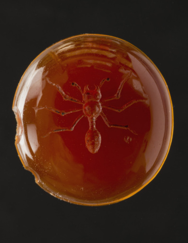 Nella corniola è raffigurata una formica vista dall'alto, con le sei zampe ben allargate, le antenne divergenti e le mandibole allargate. L'insetto è centrato in mezzo alla pietra, con un ampio spazio vuoto intorno. L'incisione è precisa e dettagliata.