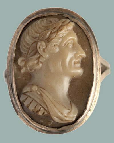 In un cammeo, legato in un anello d'oro, è raffigurato un busto maschile, tagliato al di sotto delle spalle, con corona d'alloro, di profilo verso destra. Il volto è caratterizzato dal naso importante e il mento molto pronunciato; da notare le rughe all'angolo dell'occhio, dall'arcata sopraccigliare ben marcata, e sulle guance. I capelli sono disposti a ciocche ricurve sulla nuca, al di sopra della corona d'alloro incisa, e con piccoli riccioli sulla fronte; un grande ricciolo si arrotola davanti all'orecchio scoperto. Sul busto è raffigurato il paludamentum, fermato da una fibula ritonda, che ricopre la lorica, di cui si notano gli pteryges sulla spalla. Gli elementi della raffigurazione rimandano all'iconografia imperiale antica.