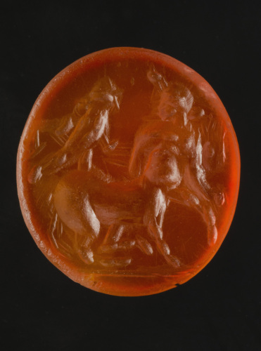 Centauro di profilo col busto di prospetto, retrospiciente con testa di profilo a sinistra; porta sul dorso un personaggio o un animale di difficile identificazione, potrebbe forse essere un erote; linea del suolo.