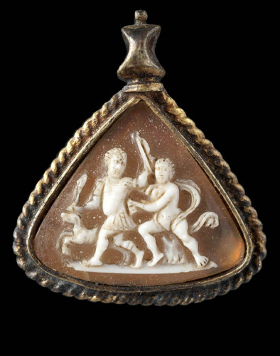 Cammeo con montatura a pendaglio: la gemma è legata in una cornice d'argento dorato decorata a cordoncino e anello per la sospensione in alto.