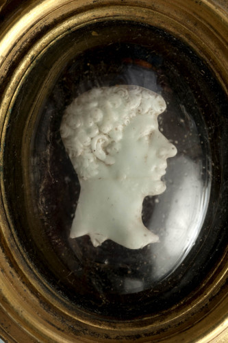 Il cammeo, racchiuso in una cornice in argento dorato con copertura in vetro soffiato e anello per la sospensione, attorno al quale si dispone una ciocca di nastro metallico (XVIII secolo), raffigura una testa maschile di profilo verso destra. Il volto è caratterizzato dagli occhi leggermente infossati, il naso importante e il mento pronunciato. I capelli, corti e ricci, sono disposti in una serie di piccole ciocche rotonde, che lasciano scoperto l'orecchio. La bocca è sormontata da corti baffi, mentre una leggera barbula di dispone lungo la linea della mascella. Da notare la linea che taglia l'immagine alla base del collo.