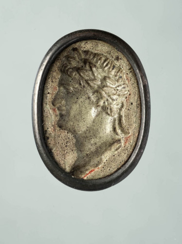 Testa maschile imberbe di profilo verso sinistra, tagliata alla base del collo. I capelli corti si dispongono sulla fronte con una breve frangia, mentre alla sommità del capo sono resi con fitti solchi paralleli. La testa è cinta da una corona d'alloro, con foglie fitte e nastri che pendono lungo il collo. Il profilo non risulta molto caratterizzato. Si tratta probabilmente della raffigurazione di un imperatore.