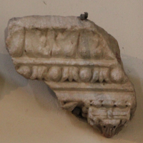 La cornice è divisa in una serie di fasce divise da listelli lisci: quella più alta è costituita da un kyma di foglie. Al di sotto, è presente invece un motivo ad ovoli inseriti in gusci, separati da lancette.