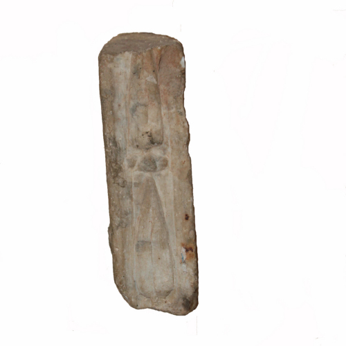 Il frammento di decorazione è lavorato su tutti e tre i lati visibili. Il quarto non è percepibile poiché poggia sul muro, in cui è inserito il reperto. Sul fronte, si rileva la presenza di un motivo costituito da fusarole e perline, entro due listelli. Sugli altri due lati, fortemente abrasi, pare di percepire la presenza di una decorazione vegetale.