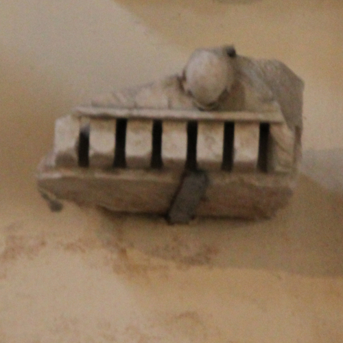La decorazione, realizzata lavorando un blocco di marmo bianco, è costituita da un ovolo, in origine affiancato da altri oggi perduti. Esso ha forma vagamente appuntita verso il basso. Al di sotto di un listello su cui esso si imposta, si trova un motivo a dentelli, in cui i singoli elementi hanno faccia rettangolare.