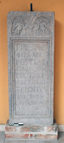 Stele funeraria parallelepipeda, entro archetti, con iscrizione.
