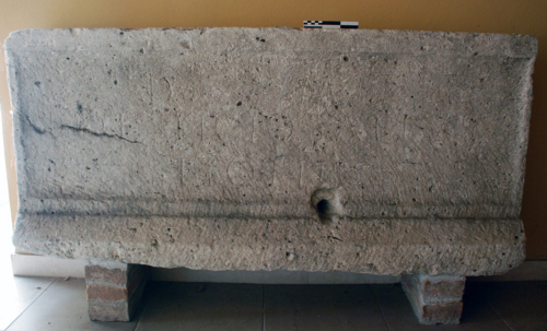 Fronte di sarcofago, con base modanata e foro circolare in prossimità del margine inferiore, al centro. La superficie è inquadrata ai lati da una cornice liscia e più stretta ai lati. Lo specchio epigrafico, all'interno del quale è incisa un'iscrizione su tre righe, è rifinito a gradina.