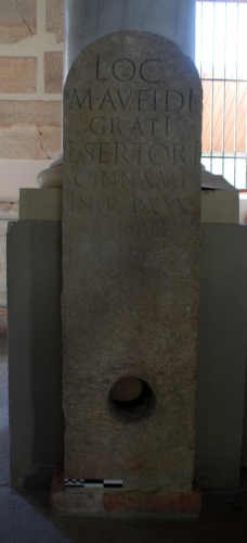 Stele centinata con foro nella parte inferiore per l'infissione e iscrizione funeraria di Lucius Sertorius Cinnamus e Marcus Aufidius Gratus.