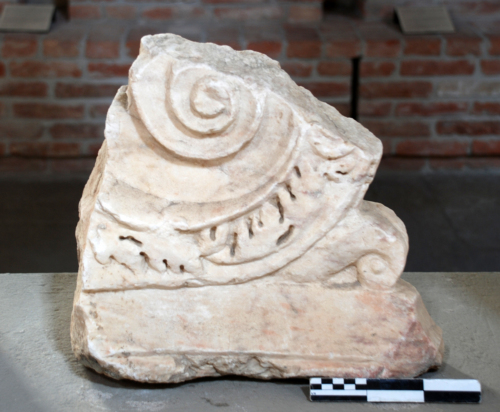 Capitello ionico di cui si conserva parte di una voluta a sostenere l'abaco.