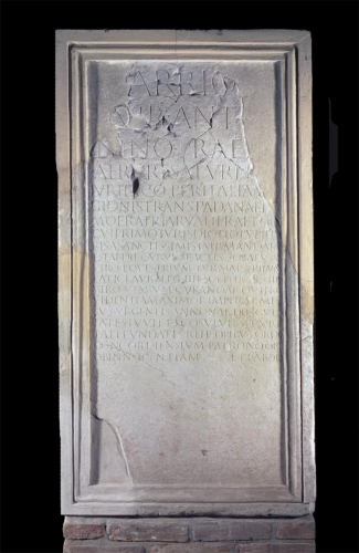 La lastra fu rinvenuta nel 1852 da L. G. Cicogna e in seguito confluì nella Collezione Muschietti.
