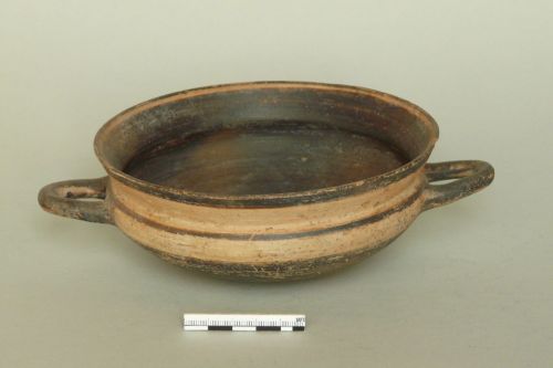 orlo espanso, vasca larga e bassa, anse a bastoncello, priva del piede. Argilla giallo-rosa; vernice nera molto opaca e tendente al grigio. A risparmio: sottile striscia all'interno dell'orlo, esterno dell'orlo e zona tra le anse.