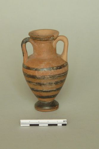 orlo verticale, imboccatura ad imbuto, collo cilindrico, spalle arrotondate, ventre ovoidale, piede troncoconico con orlo spesso;anse a nastro (una mancante), impostate sotto l'orlo e fissate alle spalle. Argilla giallognola con ingubbiatura arancio e vernice nera opaca che copre orlo, esterno delle anse e piede e viene utlilizzata per realizzare cinque fasce orizzontali di larghezza irregolare che decorano il ventre.