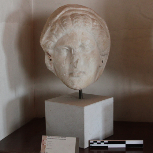 La scultura ritrae una fanciulla dolente, probabilmente parte di una stele funeraria, di cui si conserva solo il capo, fino all'attacco del collo sul mento; è scheggiata e abrasa in più punti; il naso è andato perduto, sebbene la sua forma sia in parte ricostruibile grazie all'andamento della frattura che l'ha interessato.