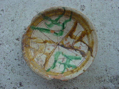 Scodella con piede ad anello leggermente umbonato, parete rettilinea a profilo obliquo, linea di carena, orlo verticale leggermente estroflesso e labbro assottigliato appiattito superiormente. All'interno del cavetto compare una croce che definisce quattro settori triangolari, campiti da fiori stilizzati marcati alternativamente da pennellate di colore giallo e verde.