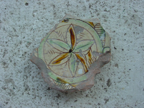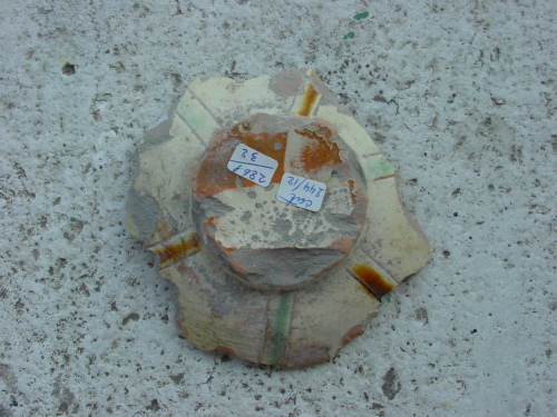 Scodella con piccolo e basso piede a disco e attacco di parete a profilo emisferico. All'interno del cavetto compare un fiore a cinque petali su gambo fogliato, alternativamente marcati da pennellate di colore verde e giallo, racchiuso da un medaglione da cui dipartono elementi lobati obliqui, probabilmente delle foglie stilizzate.