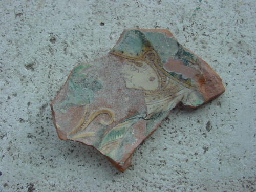Piatto con piede ad anello e attacco di parete a profilo quasi orizzontale. All'interno del cavetto compare un guerriero volto a sinistra, che indossa elmo e corazza. Sullo sfondo, dei racemi floreali stilizzati sembrano rappresentare un giardino. Il decoro graffito è marcato da pennellate di colore giallo, verde e blu