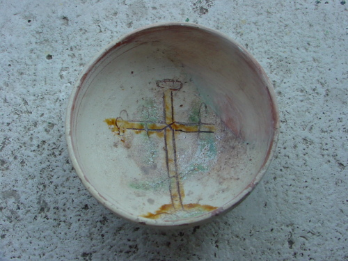 Al centro del cavetto compare una croce (di tipo ancorato) su un monticello rappresentante il Golgota, trafitta da chiodi sulla posizione delle mani e dei piedi di Cristo.