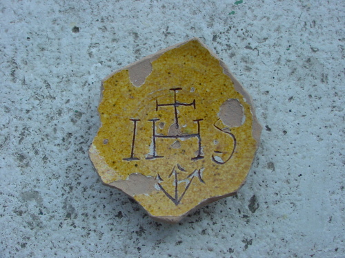 Scodella con piede ad anello umbonato e attacco di parete a profilo emisferico. Al centro del cavetto compare una croce potenziata, che poggia sul trigramma bernardiniano. Sotto la sigla IHS sono presenti tre frecce, a simboleggiare la passione di Cristo.