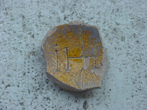Scodella con piede ad anello umbonato e attacco di parete a profilo emisferico. Al centro del cavetto compare una croce potenziata, che poggia sul trigramma bernardiniano. Sotto la sigla IHS sono presenti tre frecce, a simboleggiare la passione di Cristo.
