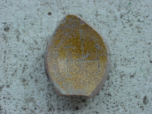 Scodella con piede ad anello umbonato e attacco di parete a profilo emisferico. Al centro del cavetto compare una croce potenziata, che poggia sul trigramma bernardiniano. Sotto la sigla IHS sono presenti tre frecce, a simboleggiare la passione di Cristo.