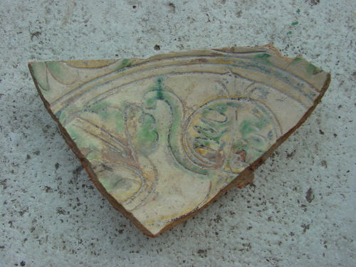 Piatto con piede ad anello leggermente umbonato e attaco di parete a profilo quasi orizzontale. All'interno del cavetto compare un motivo vegetale stilizzato, probabilmente un melograno, alternato a un fiore con foglie polilobate. Il cavetto è delimitato superiormente da una fascia campita da un decoro non meglio identificabile, forse riconducibile a un motivo vegetale stilizzato corrente.